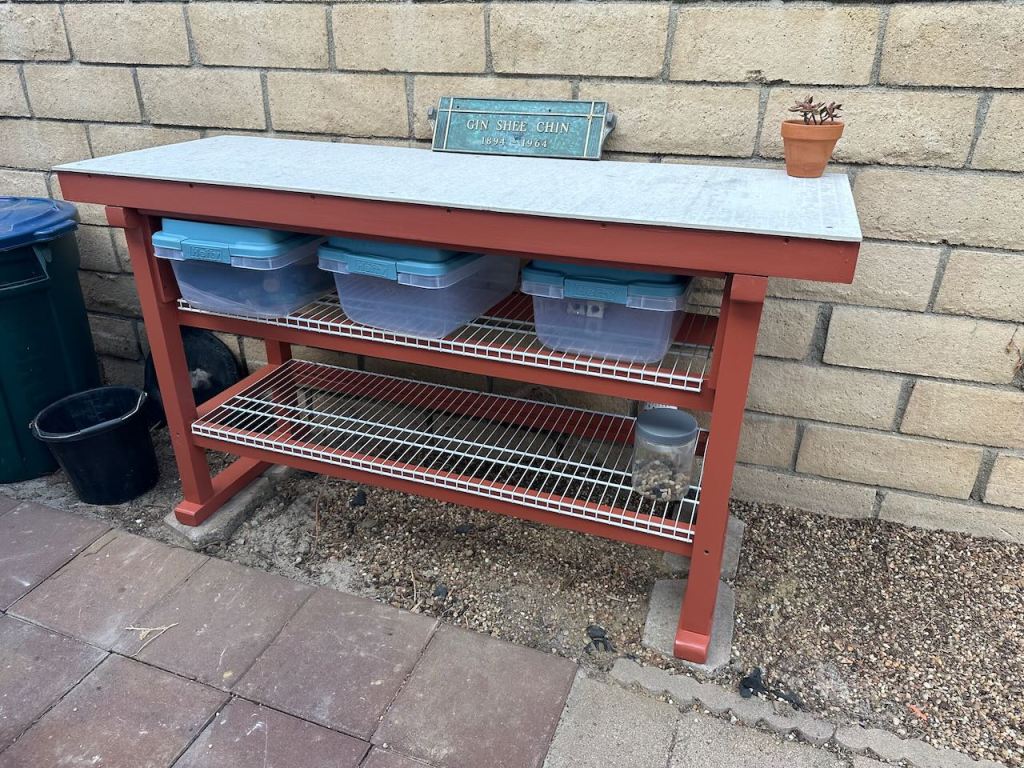 Cut some wire shelving using an angle grinder, screwed the shelves down, and put some blocks under the feet. Scored and cut some Hardibacker cement board for a work top.