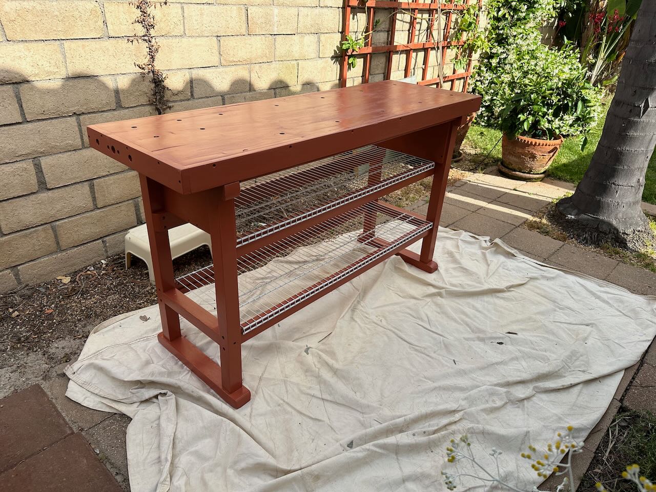 Cut some wire shelving using an angle grinder, screwed the shelves down, and put some blocks under the feet. Scored and cut some Hardibacker cement board for a work top.