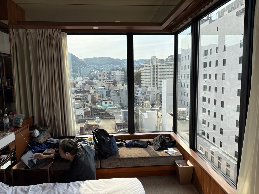 Candeo Hotel Nagasaki is suiting us well. It’s a twelve story tower in a “lobby on top” format that I’ve seen several times now in Japan. The ground level entrance to the hotel is a fancy door into a small elevator lobby. Your only elevator choice is to go up 11 floors. Otherwise the ground floor is general retail, in our Candeo’s case a Japanese version of Walgreens. The hotel reception and lounge is up on top (11th floor), the rooms are below that. Candeo has a “Sky Spa” on the top 12th floor, men’s and women’s onsens with outside rooftop pools overlooking the city lights. Here is the view from our 10th floor room.