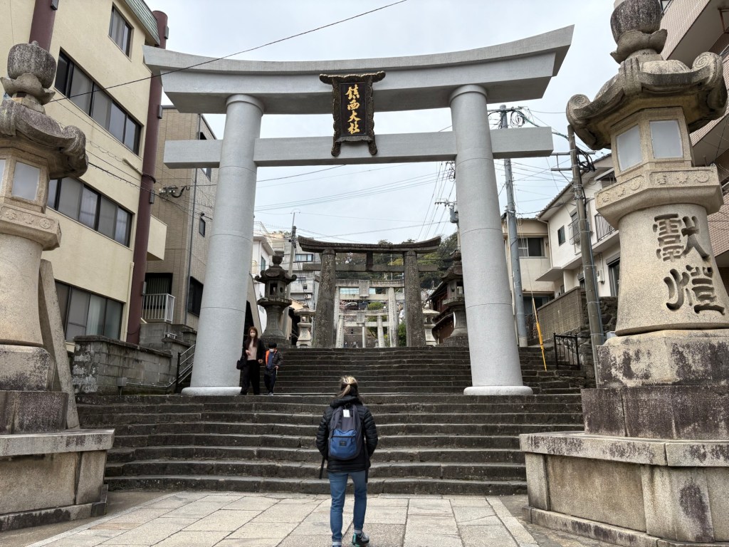 Nagasaki has several street car lines with classic old style trams, and we hopped on one towards Suwa Shrine. The busses and trams here all work with the Suica card, in our case virtual cards on our iPhones. If you visit Japan with an Apple phone be sure to load a virtual Suica card via Wallet, then add a few thousand yen to it. Riding the bus/tram/train is now effortless, just tap on and tap off.