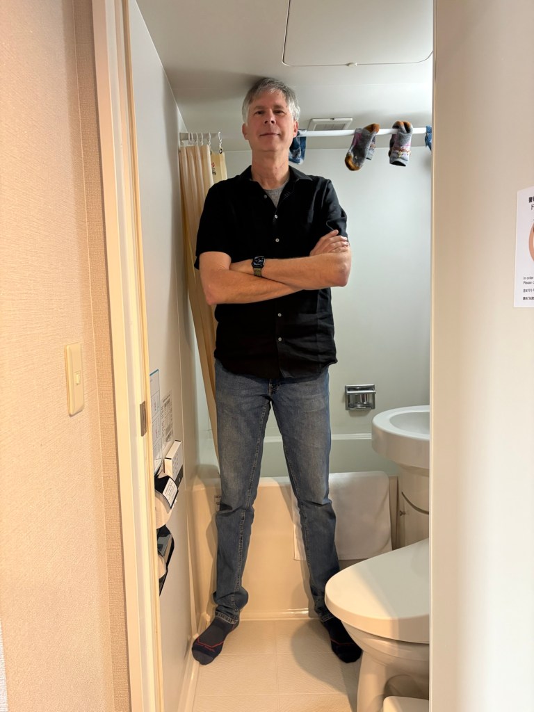 We landed for the evening at the Central Imari Hotel, which has a nice onsen attached. The guests are a mix of business travelers and two tour busses, probably for sakura. We might be the only westerners here. The bathroom is juuuuust tall enough.