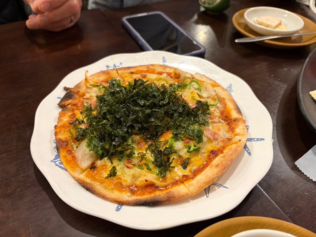 It was a great little tour! Ryoko did the ordering at the izakaya for dinner, which is always fun and a bit dangerous. Ryoko is some opposite of Michele when it comes to getting food. Michele tends towards the minimum needed, ideally no waste. Ryoko goes for abundance. Amongst the treats was this nori topped pizza. Pretty good!