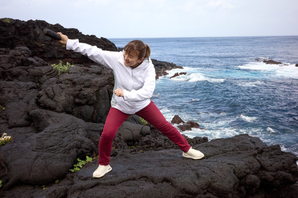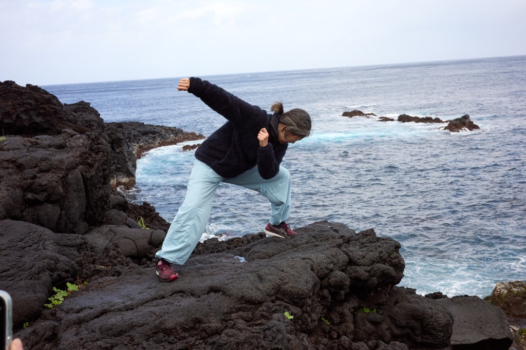 This kind of taiko playing appeals to me more than the typical kumidaiko I’ve seen in the US. Most US kumidaiko, in my humble (?) opinion, is about empowerment, players beating a drum loudly to project power. Empowerment as an art motif definitely has its place in the world, but after a few years it got to be a kind of one note performance for me. This Hachijo style has a wider emotional range, and I love the duet musical interplay. If I lived on Hachijo I would pick up some bachi and learn.