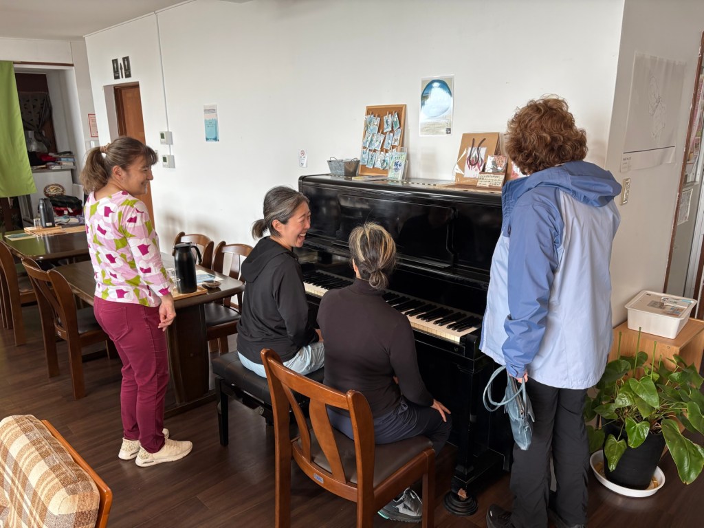 L.L. had Japanese breakfasts on offer and good coffee. They also had a piano. Michele showed Ryoko how to play chopsticks and Ryoko showed Michele the equivalent easy tune Japanese kids learn, along with some other tunes.