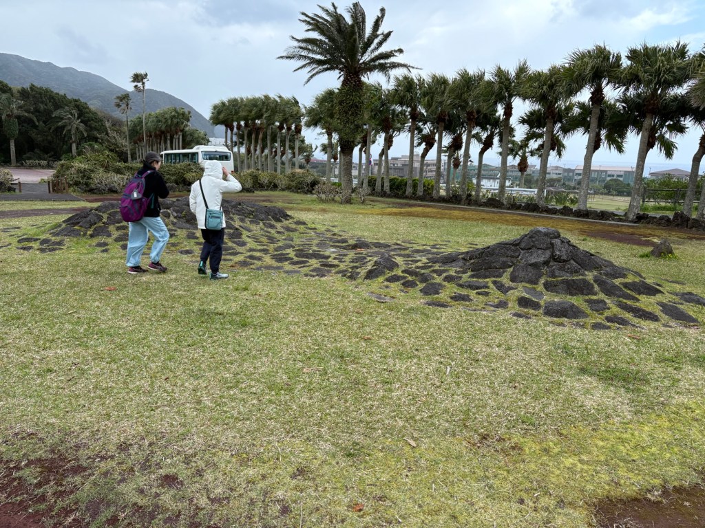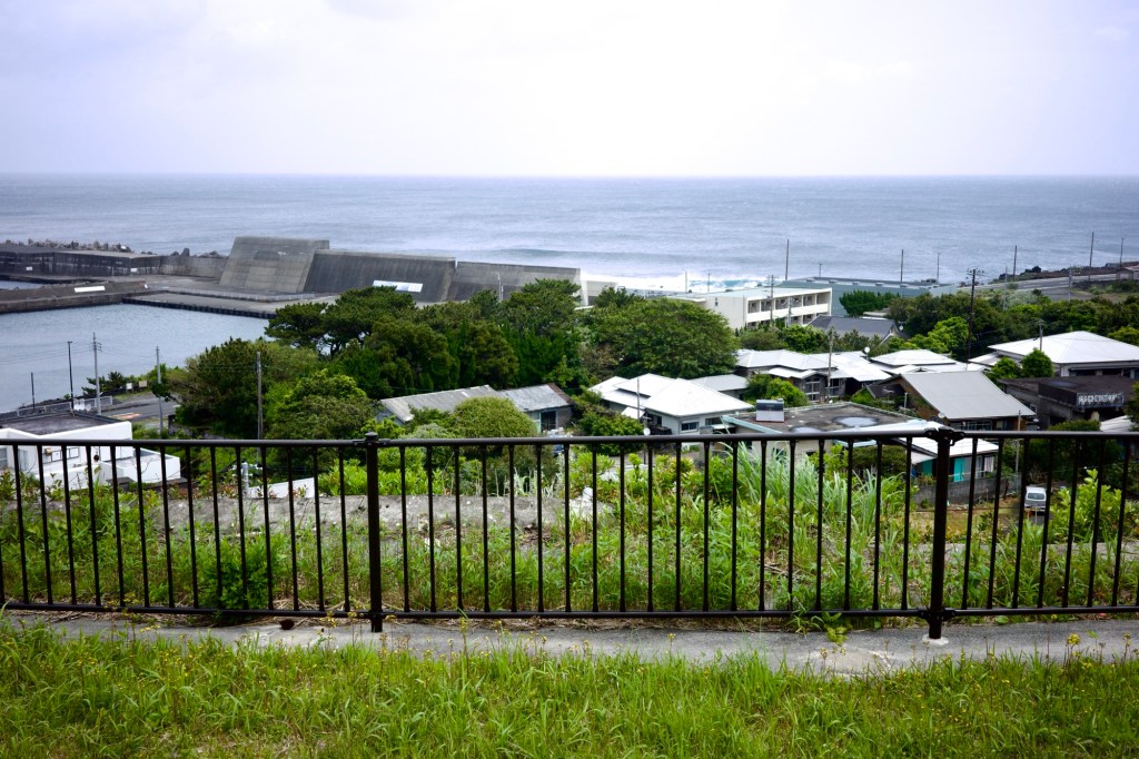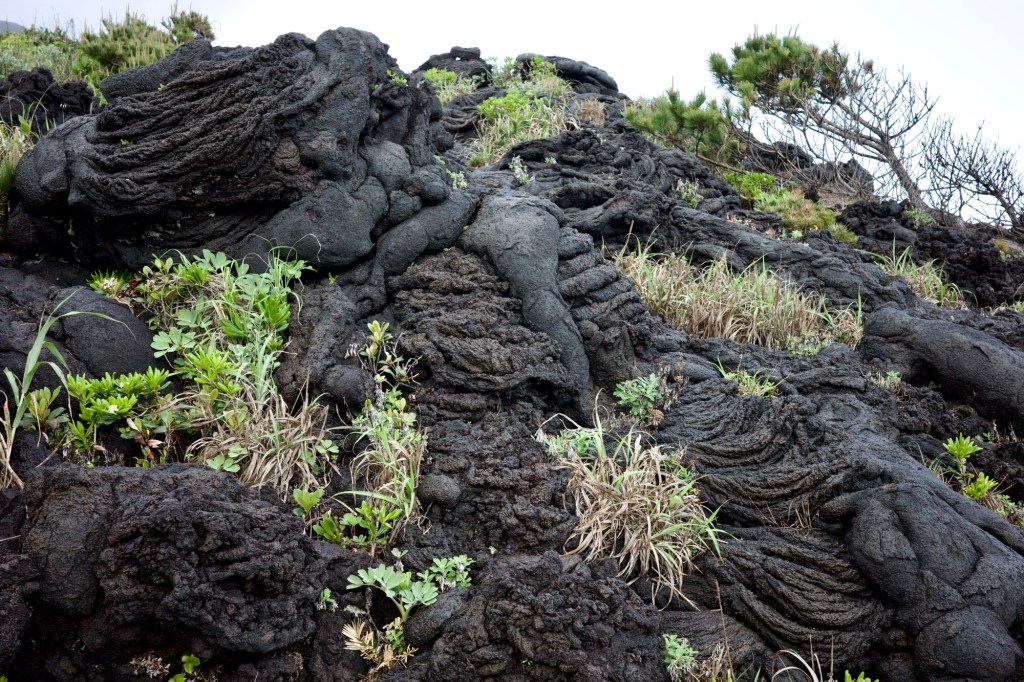Back in the van, and Yuko drove some more narrow lonely roads, around the side of Hachijo Fuji, until we arrived at a meeting hall next to a hotel that was being renovated. The surrounding land was mostly lava rock.